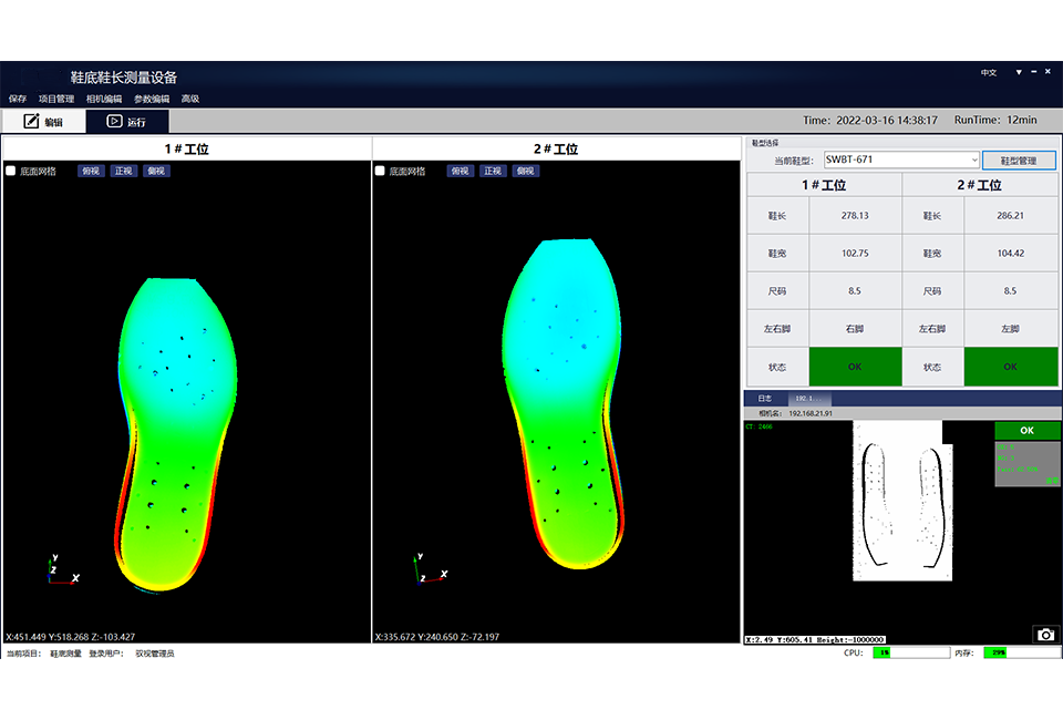 大底3D智能检测系统基于线激光扫描3D相机,,搭载自主研发的3D视觉软件,,对大底进行智能码数识别和左右脚判断。。。。线激光扫描3D相机获取深度图后,,通过3D视觉软件进行数据处理,,,,给出大底的长宽高尺寸,,然后判断大底码数和左右脚,,对不在码数要求尺寸范围内的大底进行剔除。。